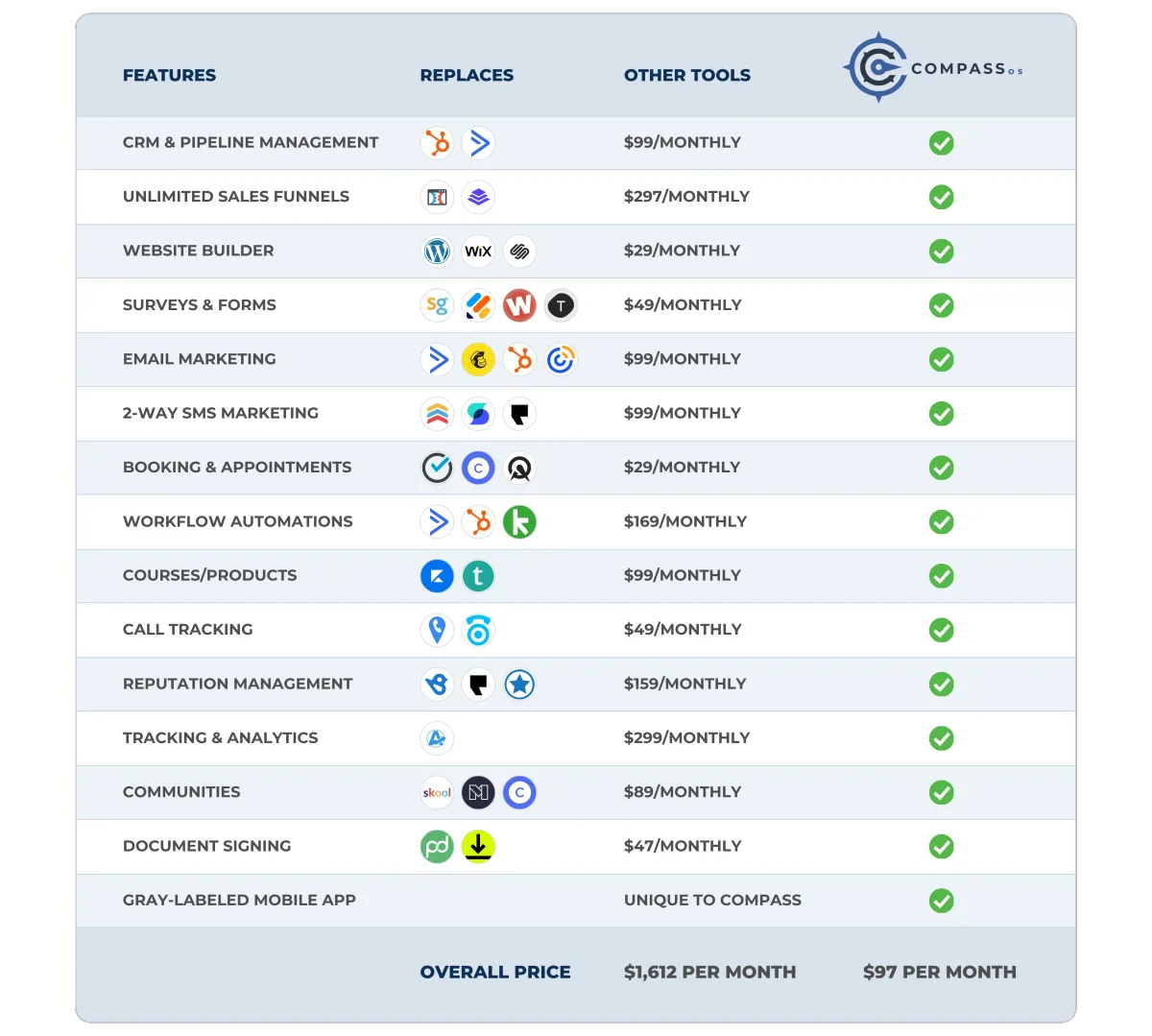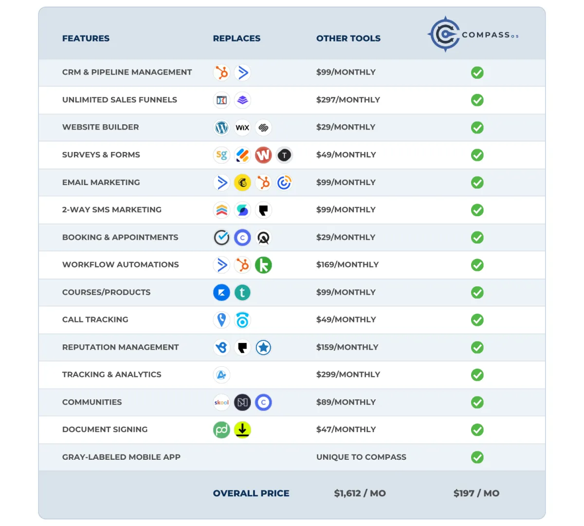 The Compass platform is a powerful platform that is engineered to simplify and consolidate the platforms you use. From calendaring to email, from funnel pages to your CRM and pipeline management - Compass does it all. Compass users save thousands a year (and often a month) by replacing all the various software platforms they previously used. Here's just some of what Compass could potentially replace for you: